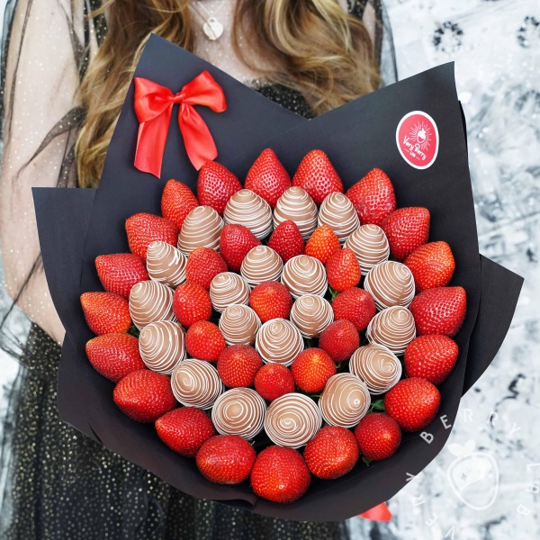 Букет «Молочный шоколад» в изысканной черной упаковке звучит тонкими нотами клубники и шоколада в сочетании с малиной и голубикой.
