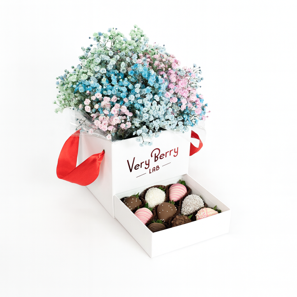 Сказочное сочетание гипсофилов с клубникой в шоколаде в шкатулке.