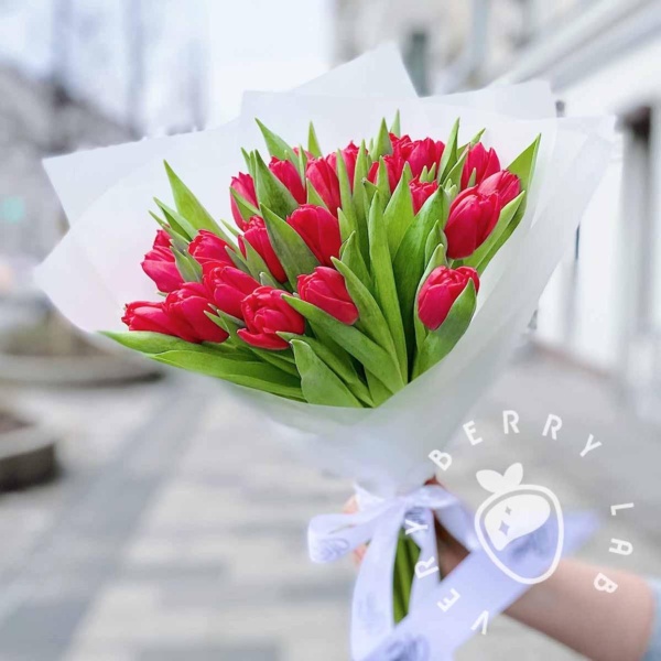 Яркие красные хрустящие тюльпаны, в стильной упаковке.