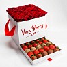Красные розы и вкусовое изобилие клубники в шоколадном разнообразии в шкатулке.