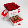 Букет из красных роз в белой шкатулке с клубникой в шоколаде.